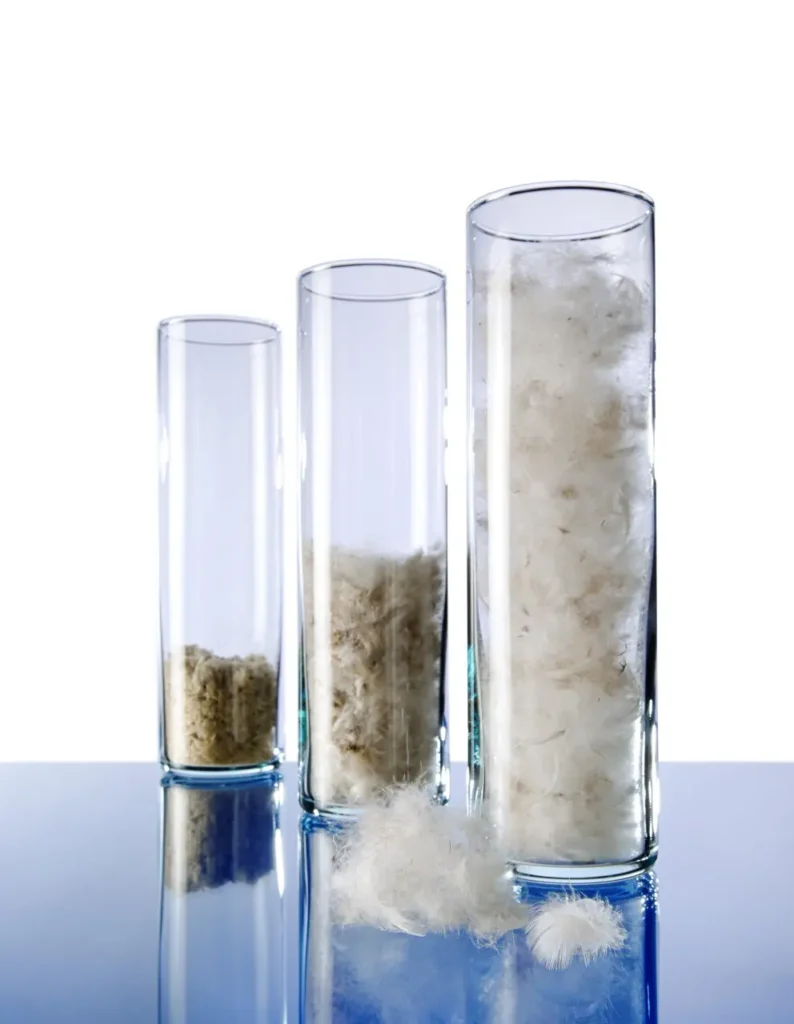 Billederne med de tre dunfyldte glas skal illustrere, hvad der sker med dunene, hvis de ikke bliver behandlet korrekt. Med vores vasketeknologi sørger vi for, at dine dun behandles fagmæssigt korrekt, og forbliver lyse og luftige som i det forreste glas.